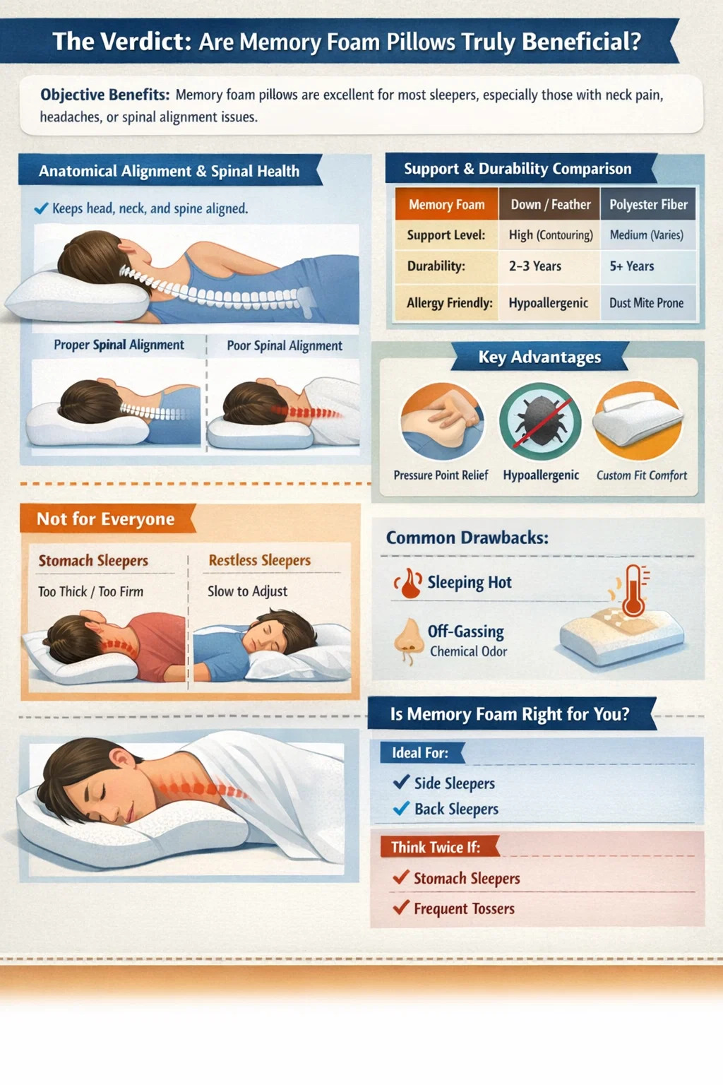 Önemli ortopedik avantajlar sunarken, evrensel olarak her derde deva değiller. Onların "iyiliği" büyük ölçüde kişisel uyku duruşunuza, ısı toleransınıza ve maddi kokulara karşı duyarlılığınıza bağlıdır. Yan veya sırt üstü uyuyan kişiler için hafızalı köpük yastık, Uyku hijyeni için dönüştürücü araç , oysa midesi uyuyan biri bunları çok kısıtlayıcı veya katı bulabilir.