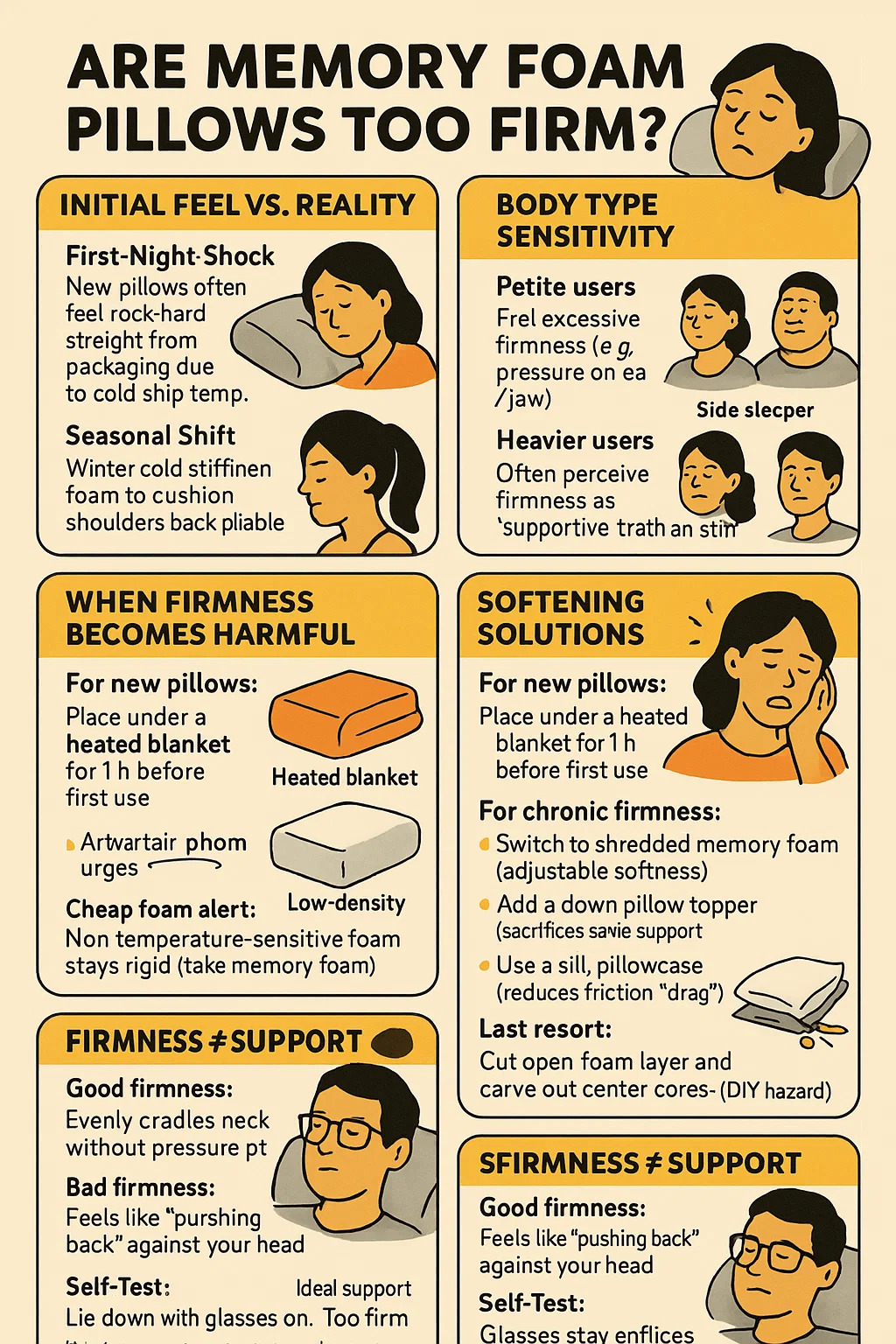 Kronik sertlik için: → Parçalanmış hafızalı köpüğe geçin (ayarlanabilir yumuşaklık). → Kuş tüyü bir yastık kabanı ekleyin (bir miktar destekten ödün verir). → İpek bir yastık kılıfı kullanın (sürtünmeyi "sürüklemeyi" azaltır).