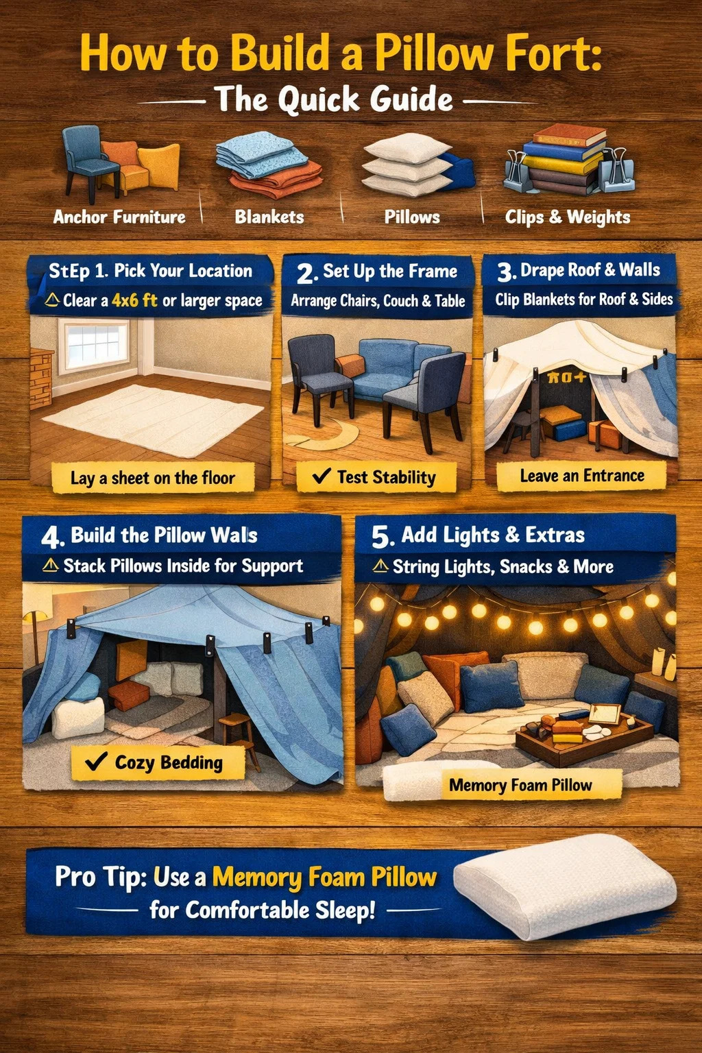 Bir yastık kalesi inşa etmek dört temel adımdan oluşur: güçlü bir temel yapı seçin (kanepe veya sandalyeler gibi), duvarları ve çatıyı oluşturmak için üst üste battaniyeler örtün, destek ve izolasyon için kenarlar ve iç kısım boyunca yastıkları istifleyin, ardından her şeyi klipsler veya ağır nesnelerle sabitleyin. İyi inşa edilmiş bir kale, şeklini saatlerce koruyabilir ve içinde doğru yastıklar bulunursa, çocukluktan kalma bir yenilikten ziyade gerçekten konforlu hale gelir.