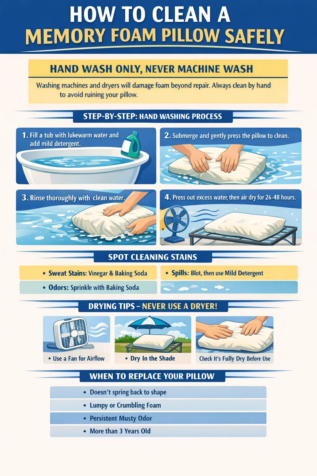Doğru yöntem, ılık su ve az miktarda yumuşak sıvı deterjanla el yıkamak ve ardından uzun bir süre açık havada kurutmaktır (tipik olarak 24 ila 48 saat). Tam yıkamalar arasında leke temizliği için, bir bezle uygulanan su ve beyaz sirke karışımı, köpüğü doyurmadan çoğu leke üzerinde etkili bir şekilde çalışır. Bu kılavuz, çok kirli hafızalı köpük yastığın rutin tazelenmesinden derinlemesine temizlenmesine kadar her senaryoyu ayrıntılı olarak kapsar.