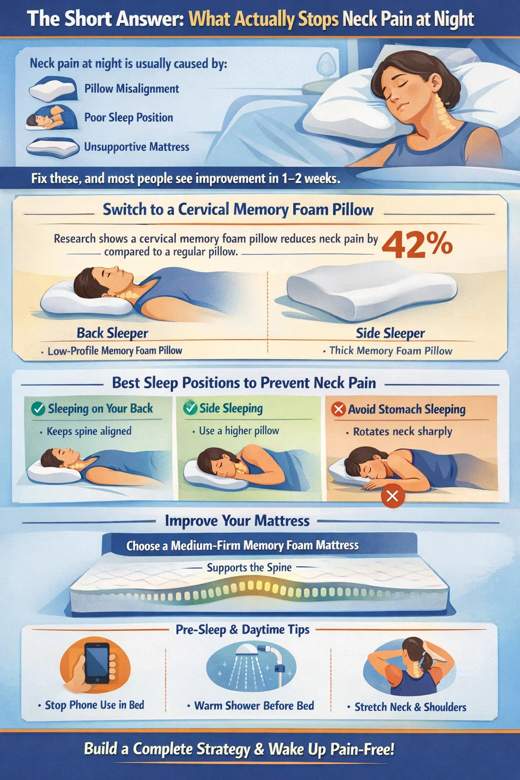 Uyurken boyun ağrısı neredeyse her zaman üç şeyden birinden kaynaklanır: Servikal omurganızın hizasını bozan bir yastık, saatlerce kaslarınızı zorlayan bir uyku pozisyonu veya omurganızın doğal eğrisini desteklemeyen bir yatak. Bu üç değişkeni düzeltin ve çoğu insan bir ila iki hafta içinde dramatik bir iyileşme görecektir.